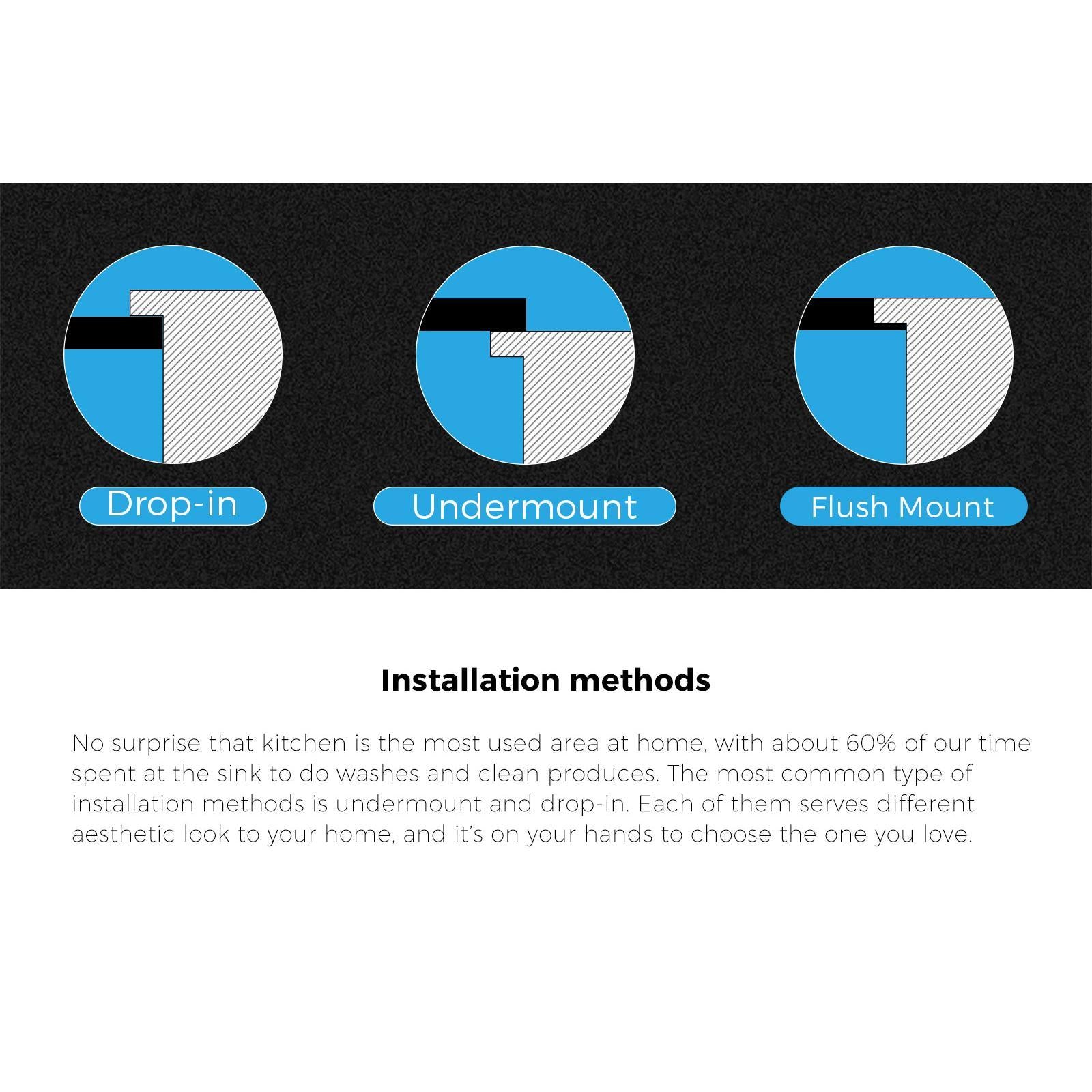 Installation:Drop-in mount, flush mount, and under mount