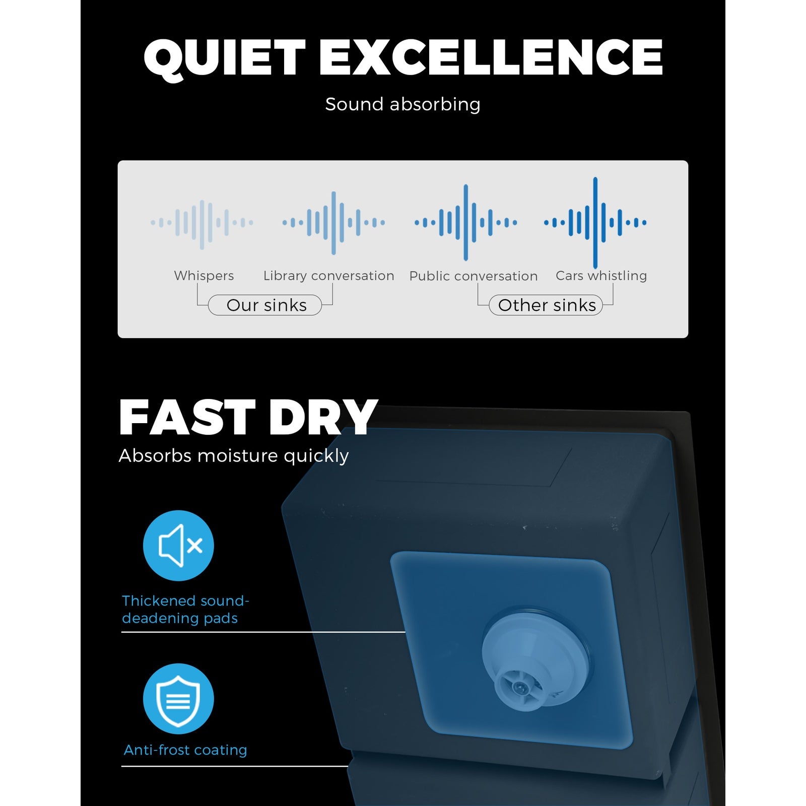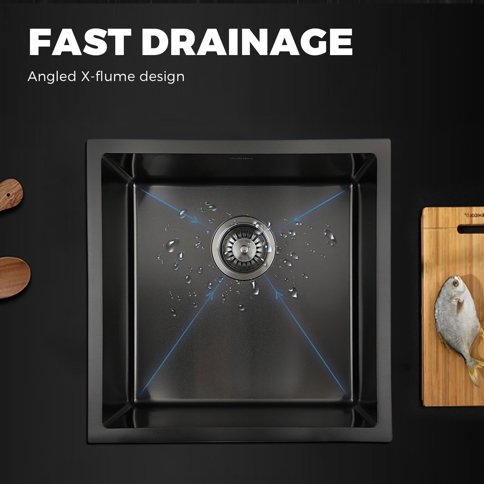 Looking for a sink that matches your expectations in every way.Then look no further than the Welba Stainless Steel Sink.Constructed of durable SUS304 stainless steel, the sink is simply built to last. With totally desirables attributes such as enhanced wear, scratch, corrosion and oil resistance, anti-bacterial, anti-fouling and food-grade safe. Plus, the nano-coated layer further adds to its refinement with a black, premium finish that simply looks and feels astounding. Better still, the deep bowl design and R10 corners provide plenty of space to do your dishes or prepare your cooking ingredients with minimum fuss. Using the sink is a joy too with its fast moisture-absorbing and anti-splash qualities that leaves the sink drier after each use. And the angled X-flume design allows quick drainage to keep the sink clear always. Not least, the Watermark-certified 304 stainless steel waste strainer, included as standard equipment, ensures that nothing gets clogged up with the plumbing.