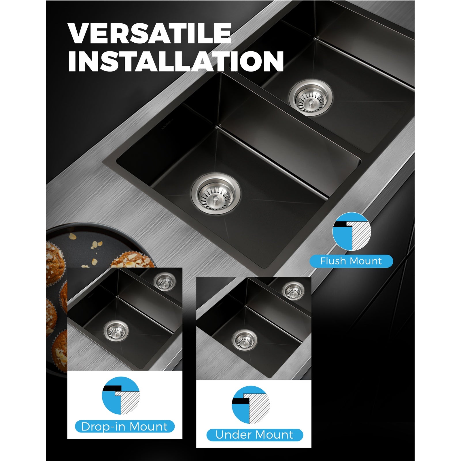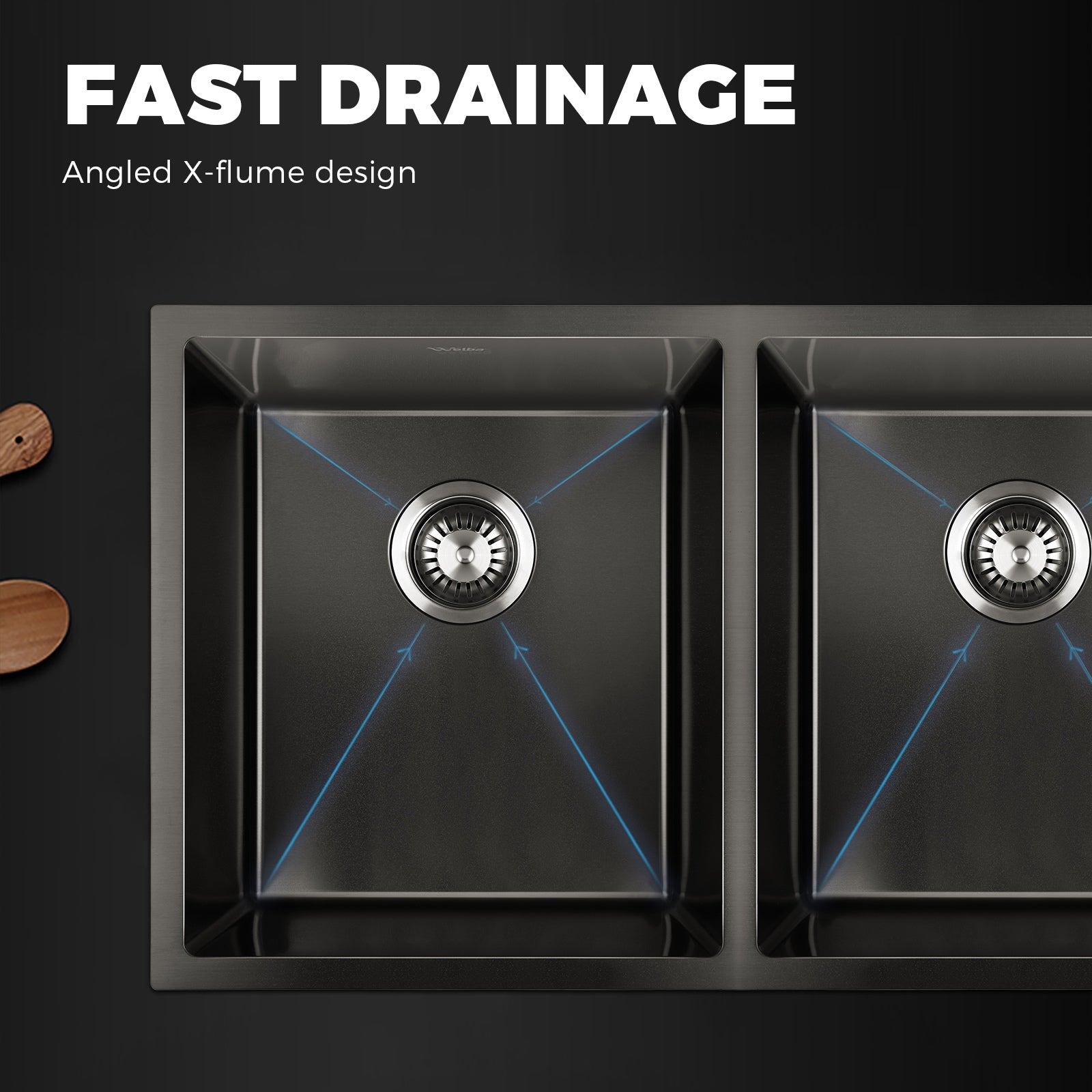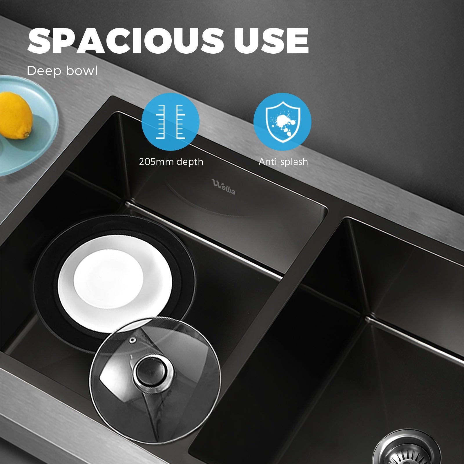 Looking for a sink that matches your expectations in every way.Then look no further than the Welba Stainless Steel Sink.Constructed of durable SUS304 stainless steel, the sink is simply built to last. With totally desirables attributes such as enhanced wear, scratch, corrosion and oil resistance, anti-bacterial, anti-fouling and food-grade safe. Plus, the nano-coated layer further adds to its refinement with a black, premium finish that simply looks and feels astounding. Better still, the deep bowl design and R10 corners provide plenty of space to do your dishes or prepare your cooking ingredients with minimum fuss.Using the sink is a joy too with its fast moisture-absorbing and anti-splash qualities that leaves the sink drier after each use. And the angled X-flume design allows quick drainage to keep the sink clear always. Not least, the Watermark-certified 304 stainless steel waste strainer, included as standard equipment, ensures that nothing gets clogged up with the plumbing.