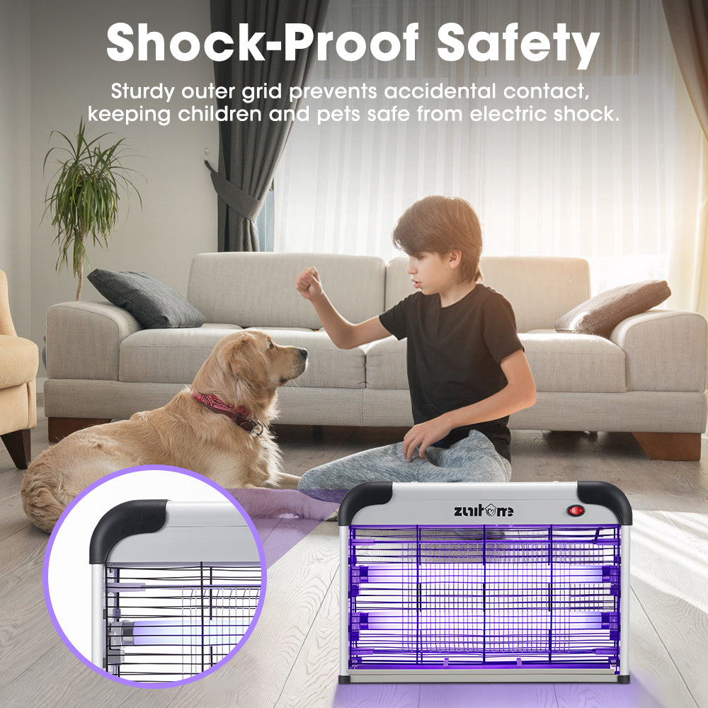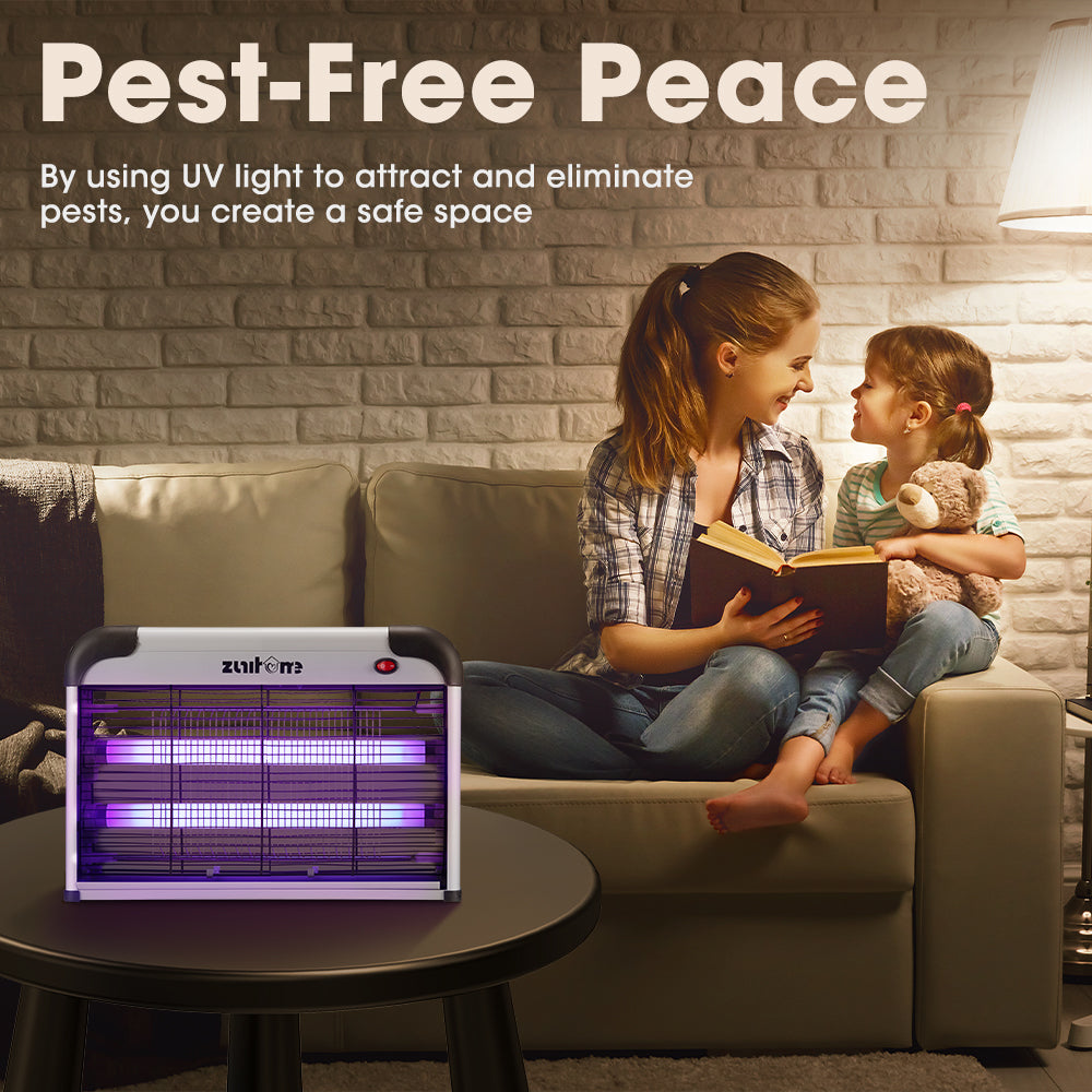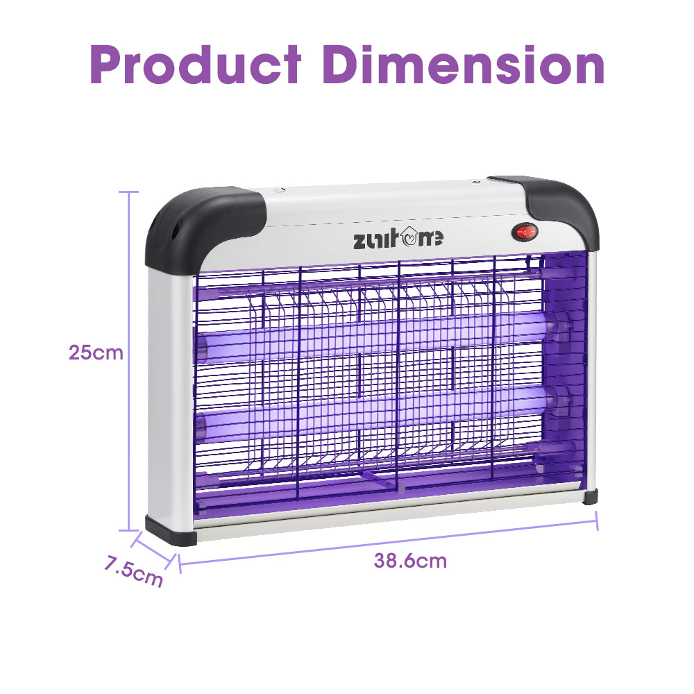 Eliminating insects on your property isn’t just about comfort—it’s crucial for health. Beyond their itchy bites, insects carry dangerous diseases. Our ZUNI insect killer uses UVA lights that emit precise wavelengths to lure bugs into a high-voltage grid, instantly zapping them to keep your space safe and comfortable. Utilizing fluorescent tubes for stronger UV rays and low-profile sides for enhanced coverage, our ZUNI electric insect killer attracts insects. With a coverage area of 40 to 60 square meters, our 20W bug zapper is perfect for homes, factories, and hospitals. Its protective grid keeps little ones and pets safe from electric shock, while the durable aluminium alloy design resists rust and corrosion. Eco-friendly and energy-efficient, our insect killer lamp kills insects using high-voltage grids without pesticides or poisons, making it a safe and energy-saving choice. Enjoy effortless cleaning and versatile setup with our electric insect killer lamp—your bug-free solution.