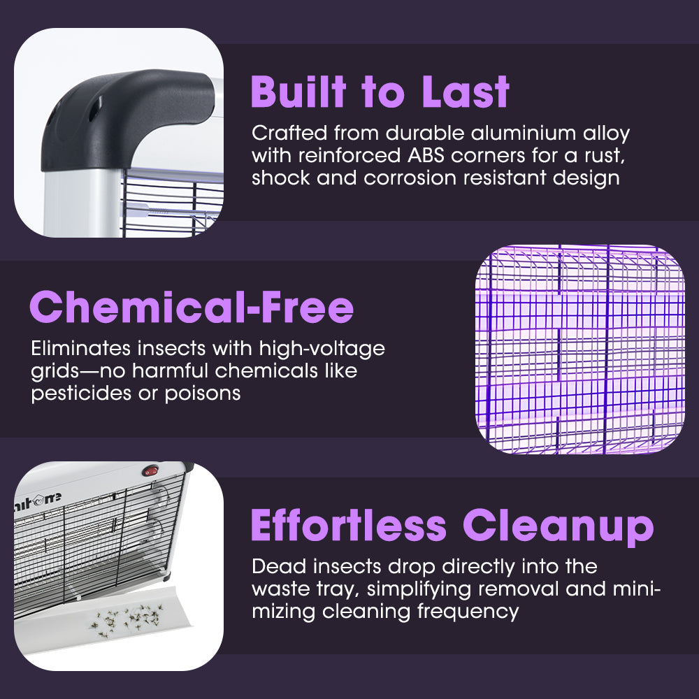• Easy to Clean: Dead insects drop straight into the waste tray with the vertical grid, making removal easy and reducing the need for frequent cleaning.